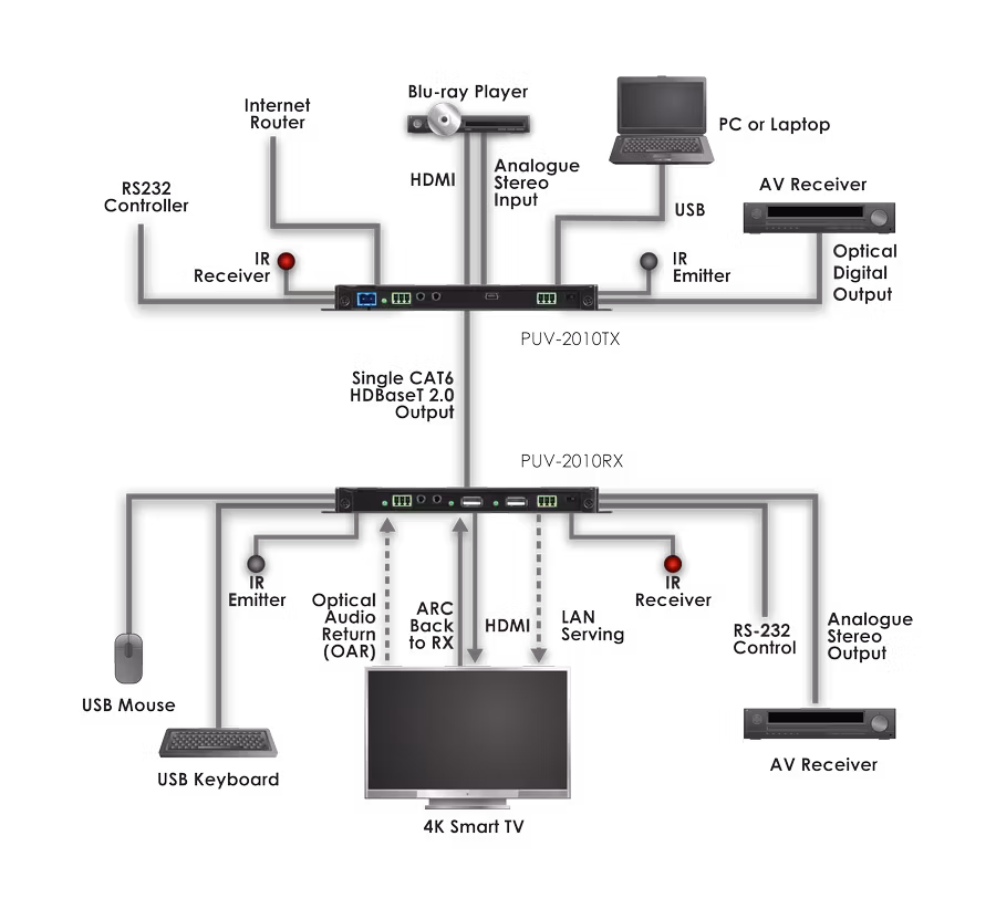HDBaseT 5-Play™ convergence: High-Definition video and audio, 100BaseT Ethernet, PoH (Power over HDBaseT) and control (Bi-Directional IR & RS-232 pass through)