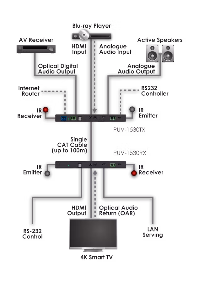 The PU-1530TX Transmitter enables transmission of video resolutions up to 4K UHD, along with HD audio, 2-Way IR, RS-232, PoH (Power over HDBaseT), OAR (Optical Audio Return), and LAN signals up to 100m. This solution provides advanced signal management ensuring reliable results in the most demanding installation environments. All audio, video, control, and power are transmitted simultaneously over a single CAT6a/7 cable up to 100m.