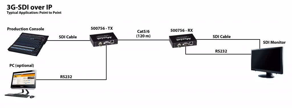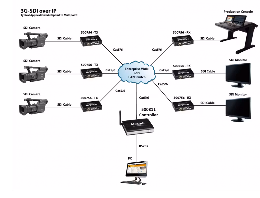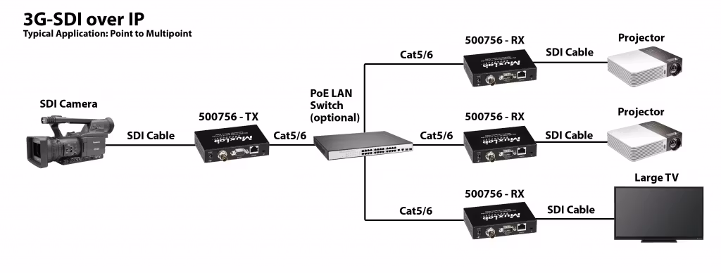 The MuxLab 500756 – 3G-SDI /RS232 over IP Extender with PoE allows easy extension and distribution of broadcast quality SDI, HD-SDI or 3G-SDI video with embedded audio over local area networks (LAN).
