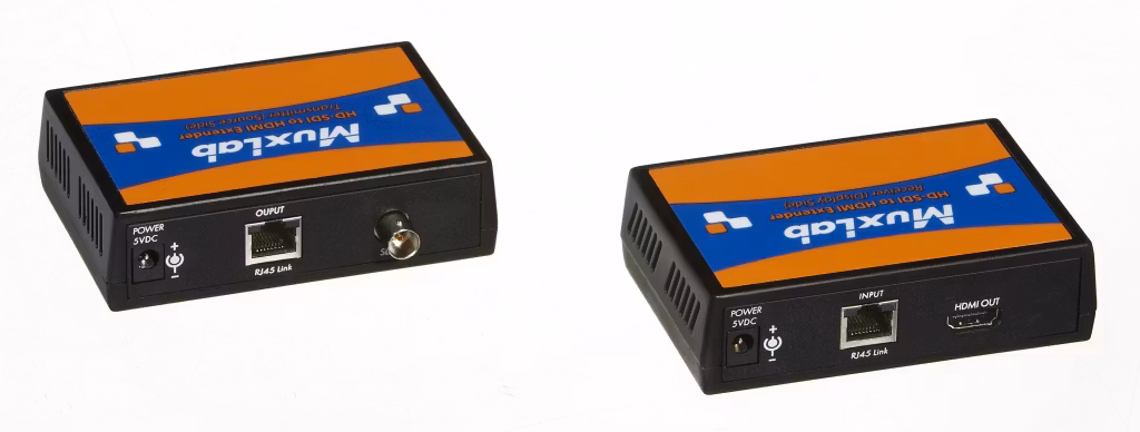 Här har vi en 3G-SDI till HDMI förlängningskit som med hjälp av en nätverkkkabel kan förlänga en HD-SDI signal upp till 100 meter i en point-to-point konfiguration.The 3G-SDI to HDMI Extender Kit (500715) converts HD-SDI to HDMI and then transmits it up to 330 ft (100m) via Cat5e/6 cable at all resolutions in a point-to-point configuration. The HD-SDI to HDMI Extender Kit supports transmission of up to 2.97/3.0 Gbps uncompressed, un-encrypted digital video (optionally including embedded Audio and/or Time Code) within television facilities and between professional video equipment.