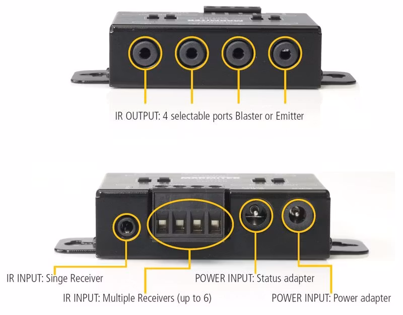 IR output: 4x 3.5mm jack plug (mono), switchable for IR extension cables with emitter or blaster LEDs