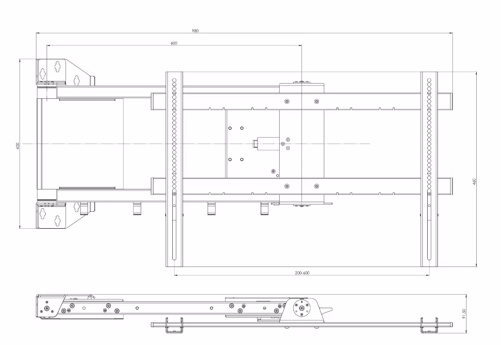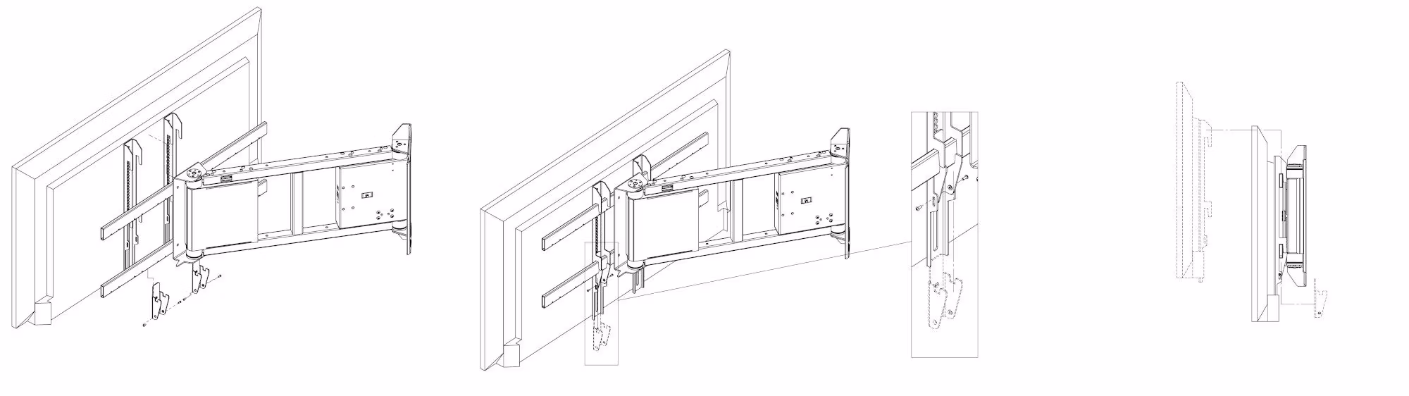 Man kan dra ut TV:n 600mm från vägg och motorstyrningen funkar på båda lederna. Dels längst ut så man kan svänga den höger eller vänster upp till 130º, men även inne i själva fästet där man fäster den mot vägg så man kan vrida höger eller vänster även där.