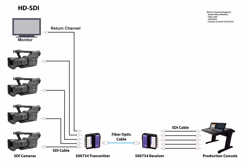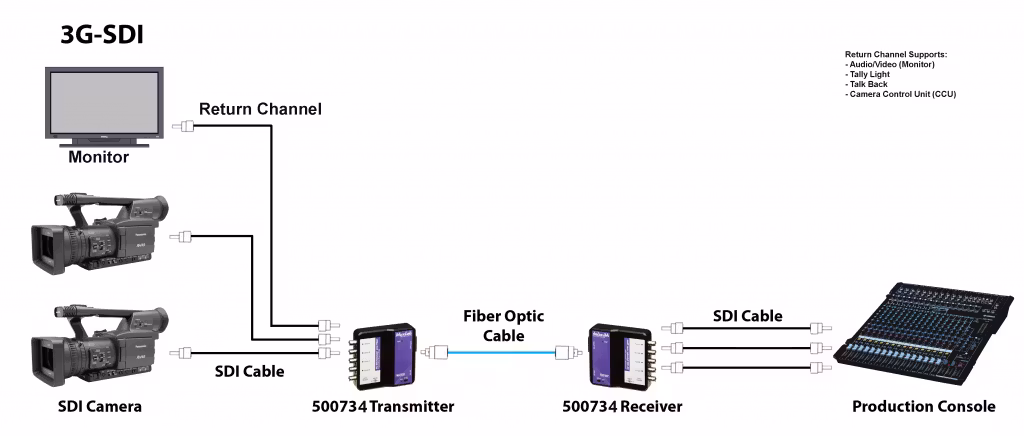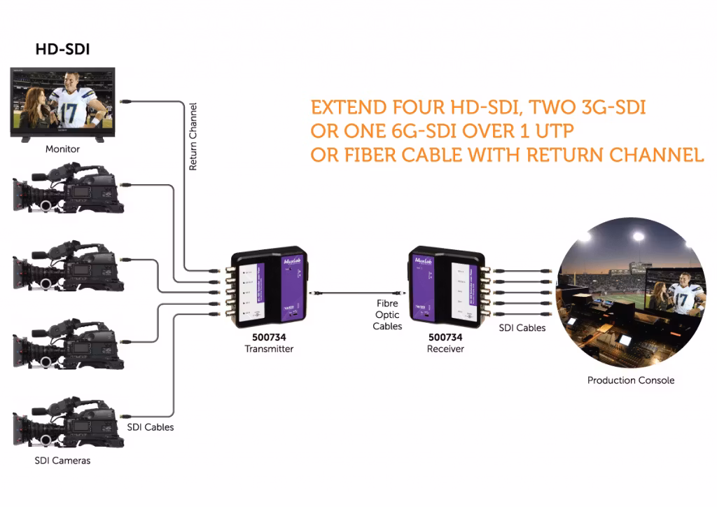 The 6G-SDI Extender over Fiber Optic with Return Channel is a unique solution from MuxLab for extending SDI cameras or other SDI sources in up to 4K resolutions to a distance of up to 400m (1300ft) using OM4 multi-mode fiber (model 500734), 10km (33,000ft) using single-mode fiber (model 500734-SM10), 40km (132,000ft) using single-mode fiber (model 500734-SM40), and 80km (264,000ft) using single-mode fiber (model 500734-SM80).