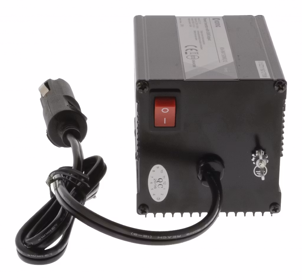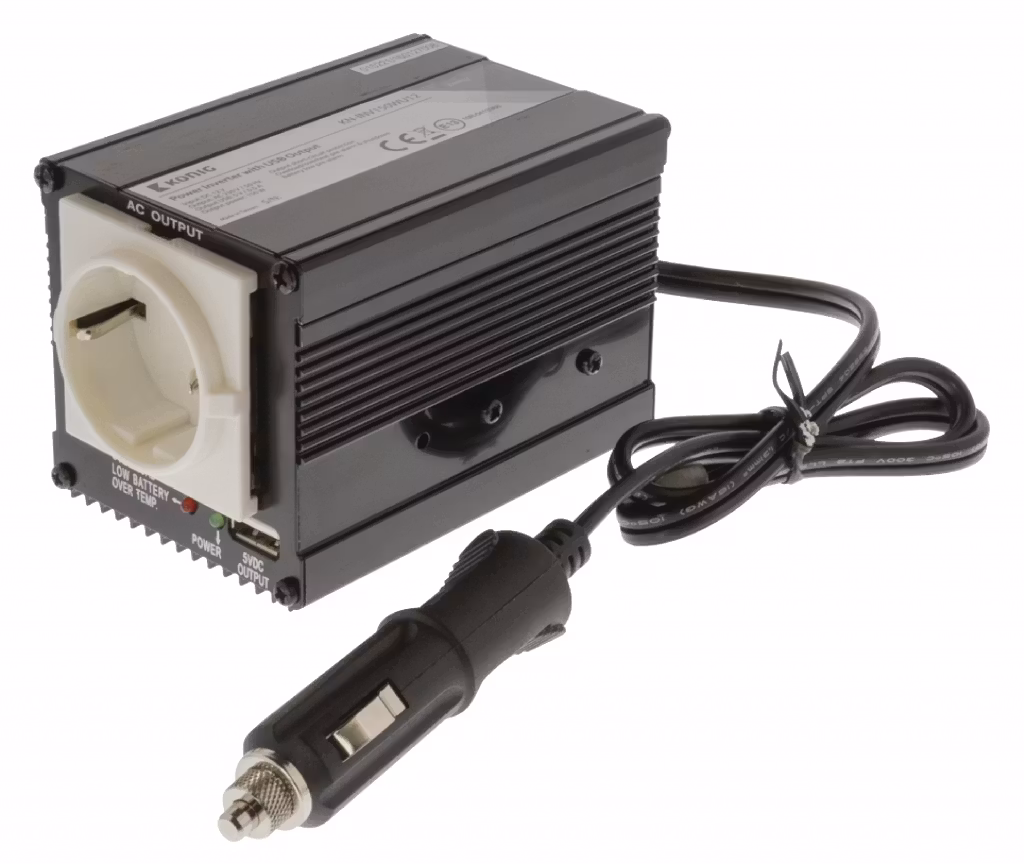En vanlig växelriktare från 12V DC till 230V AC. Med hjälp av denna kan 230V utrustning anslutas till bil- eller båtbatteri.